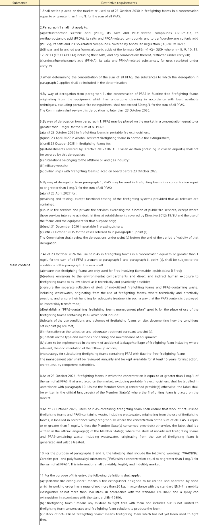 On October 3, 2025, the Official Journal of the EU published Regulation (EU) 2025/1988, aimed at adding entry 82 to Annex XVII of REACH to restrict PFAS in firefighting foams. This Regulation shall enter into force on the twentieth day following that of its publication in the Official Journal of the EU.