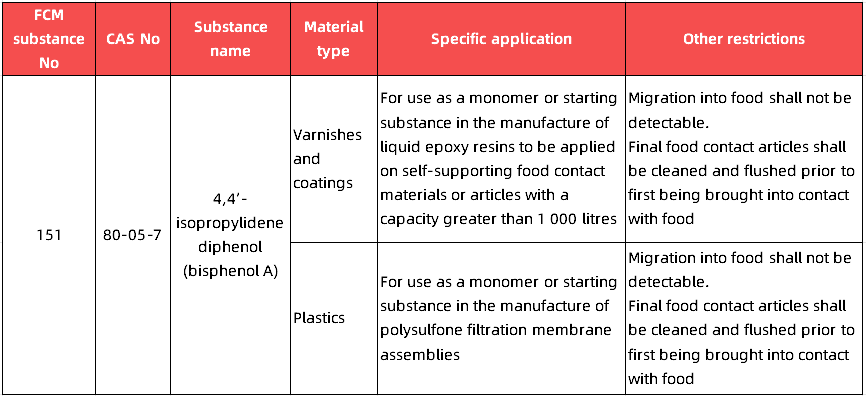 ● The use of Bisphenol A (BPA) and its salts in the manufacture of food contact materials and articles is prohibited, by way of derogation for specific applications set out in Annex II. Bisphenol-A diglycidyl etherr (BADGE) (CAS No 1675-54-3) can be used in the manufacture of food contact materials and articles; However, such articles shall not contain any residual BPA.
