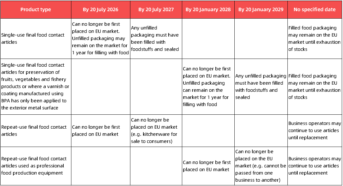 ● For food contact materials and articles in which BPA may be used in accordance with Annex II of the Regulation, it will be necessary to demonstrate that migration of BPA does not occur above the detection limit (with a detection limit of 1 μg/kg).
