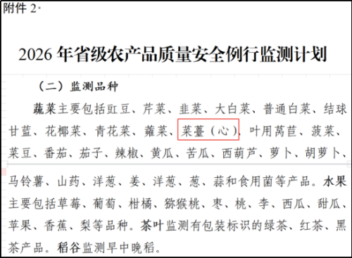 2026年国抽更强调“突出问题导向”,菜薹这类风险较低的品种纳入地方常规轮动监测或特色小宗品种范畴,而非国家级的重点细类。