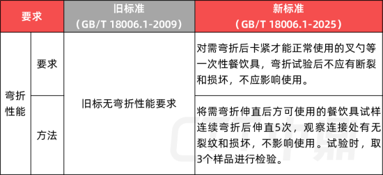 弯折性能为新版标准新增项目,主要适用于需弯折后卡紧才能正常使用的叉、勺等一次性餐饮具。标准要求试样连续弯折并伸直5次后,不应出现断裂、损坏,且不得影响正常使用。