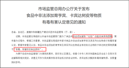 与“壮阳酒”屡禁不止有关。 育亨宾作为生物碱,滥用或误食可能导致心率加快、血压剧烈波动、焦虑、震颤等不良反应,对心血管系统存在较大风险。根据市场监管总局办公厅文件市监稽发〔2025〕90 号,食品中非法添加的育亨宾及其系列衍生物或含有该类化合物的卡宾达树皮等物质属于“有毒、有害的非食品原料”。