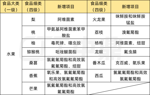 涉及苹果(啶虫脒、毒死蜱)、枣(氰戊菊酯和S-氰戊菊酯)、草莓(敌敌畏)、香蕉(多菌灵、甲拌磷、烯唑醇、噻唑膦)、火龙果(氟虫腈)、杨梅(苯甲酸及其钠盐、敌敌畏)等。
