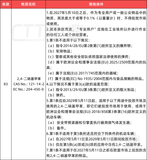 2026年4月20日,欧盟官方公报(OJ)发布了 (EU) 2026/859法规,在REACH附录XVII中新增83条款,正式对2,4-二硝基甲苯提出了限制要求。该法规自发布之日起20天后生效。