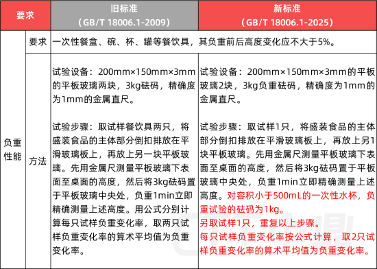新版标准在负重性能项目上对试验条件作了进一步细化。除常规产品继续采用3kg砝码外,针对容积小于500mL的一次性水杯,标准明确调整为采用1kg砝码进行试验。该变化体现了测试条件与产品实际使用特征之间的进一步匹配。